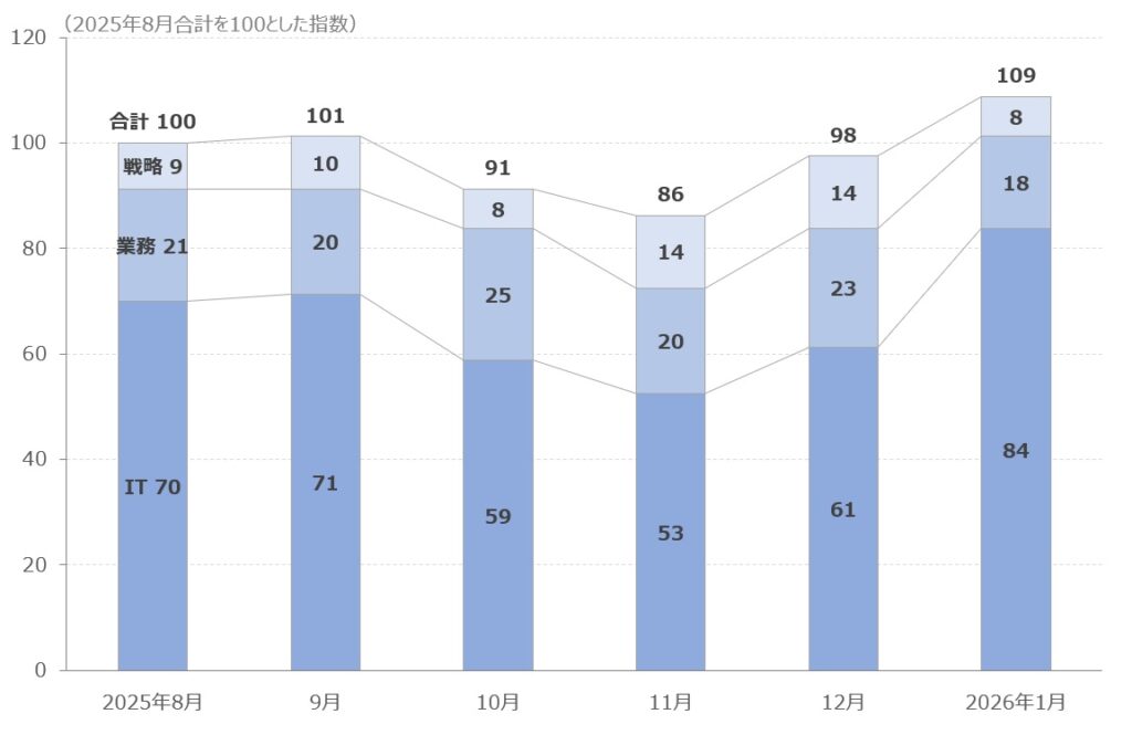 戦略案件:-6(前月比-43%)、業務案件:-5(同-22%)、IT案件+23(同+38%)となっています。
